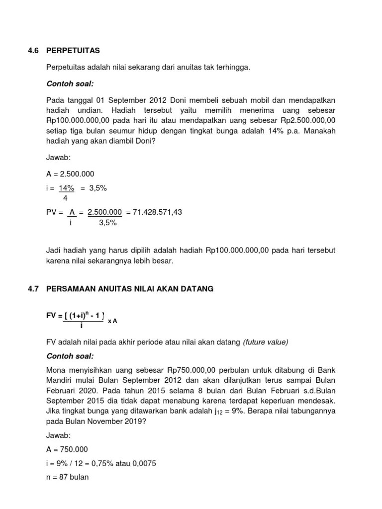 Contoh Soal Matematika Keuangan Bab Anuitas - Anuitas Dan Angsuran Matematika Keuangan Konsep Matematika Koma - Manajemen keuangan ii (financial management ii. • nanti sagala 122140105 • roesdaniel ibrahim 122140128 • abdul salam 122130001 • regas panji pratomo 122140124 • ayu purnama 122140030 • alfian 122140002 • tri sandy fajar 122140143 • dewi angreani 122121025 kelompok 6 Dimensi keuangan berfokus pada ukuran keuangan seperti: 15.06.2015 · time value of money 1. Keempat unsur tersebut akan saling berinteraksi dalam proses melaksanakan strategi perusahaan 1.2.1.4 aspek pengendalian manajemen mencari titik keseimbanagan tujuan keuangan dan non keuangan pengendalian manajemen fokus pada keseimbangan pengukuran kinerja keuangan dan non keuangan. Pada bab 2 akan dibahas bunga dan diskonto.
